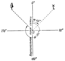 На рис. 20 показаны дирекционные углы в данной точке О (полюс) на ветряную мельницу (а =45°) и отдельное дерево (а =315°).