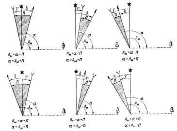 Пример: Ам = 175°; δ= —4° (западное); γ= +2° (восточное). α = 175° + [—4° — (+2°)] = 169°