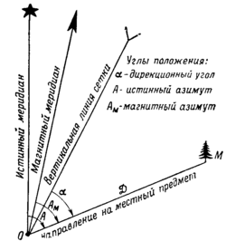 При ориентировании по сторонам горизонта за направление меридиана обычно принимают направление магнитной стрелки компаса. Оно не совпадает с направлением истинного меридиана и лишь приближенно указывает направление север—юг. Направление магнитной стрелки называется в отличие от истинного (географического) меридиана магнитным меридианом.