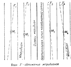 Угол между северным направлением истинного меридиана данной точки и вертикальной линии координатной сетки называется сближением меридианов и обозначается греческой буквой γ (гамма).