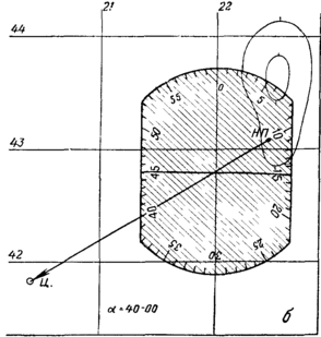 При измерении дирекционного угла артиллерийским кругом надо, наложив центр круга на точку пересечения определяемого направления с вертикальной километровой линией сетки, совместить нулевой штрих круга с северным направлением этой километровой линии, как показано на рис. 15,б. Величину дирекционного угла получим, взяв отсчет по шкале круга против определяемого направления, пользуясь при этом красной (т. е. возрастающей по ходу часовой стрелки) оцифровкой делений.