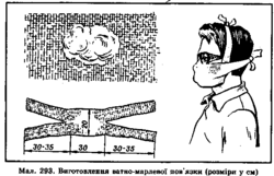 Ватно-марлева пов'язка (рис. 2) виготовляється із шматка марлі розміром 100x50 см. Його розстеляють на столі, посередині на площі 30x20 см кладуть шар вати завтовшки 1—2 см (якщо немає вати, то її замінюють марлею в 5—6 шарів). Вільний край марлі по довжині загинають з обох боків на вату, а на кінцях роблять розрізи (30—35 см).