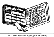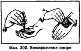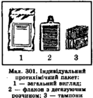 Індивідуальний протихімічний пакет ІПП-8 призначений для знезараження краплиннорідких ОР, що потрапили на відкриті ділянки шкіри та одяг. До комплекту входять флакон з дегазувальним розчином і чотири ватно-марлеві тампони (мал. 301). Посуд і тампони запаяні в герметичну оболонку з поліетилену. При використанні ІПП-8 тампони щедро змочують розчином. (Слід пам'ятати, що цей розчин — отруйна рідина, і стежити, щоб не потрапив у очі.) Першим тампоном видаляють із шкірного покриву ОР щипковим рухом, наступна обробка — протирання ураженої ділянки (мал. 302).