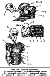 Ізолюючі протигази ІП-46, ІП-4, ІП-5 (мал. 298) забезпечують захист органів дихання, очей і шкіри від будь-яких СДОР, незалежно від властивостей і концентрації. Вони дають змогу працювати навіть там, де зовсім немає кисню у повітрі. У протигазі ІП-46М або ІП-5 можна виконувати неважку роботу під водою на глибині до 7 м. Принцип роботи ізолюючих протигазів ґрунтується на виділенні кисню з хімічних речовин при поглинанні вуглекислого газу і вологи, які видихаються людиною.