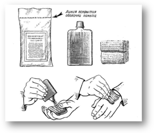 Рис. 1. Индивидуальный противохимический пакет и пример пользования им