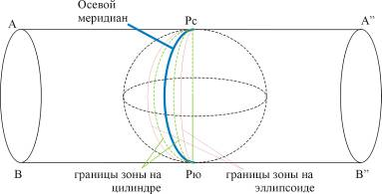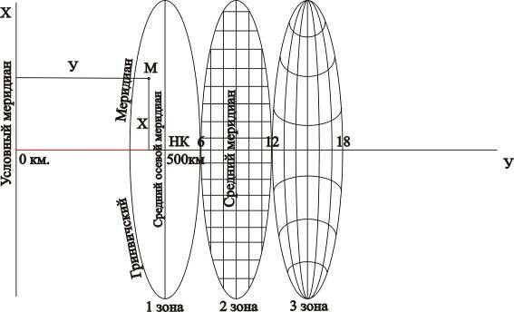 В третьей зоне этого рисунка показан общий вид сетки геодезических меридианов и параллелей. В каждой зоне осевой меридиан (как меридиан касания) изображается прямой линией в натуральную величину. Остальные меридианы зоны изображаются кривыми линиями, причем кривизна их увеличивается по мере удаления от осевого меридиана. На глобусе все меридианы имеют одинаковую длину. Следовательно, все меридианы в зоне, кроме среднего, вытянуты по сравнению с соответственными меридианами на глобусе. Экватор изображается прямой линией, а остальные параллельными кривыми. Все параллели, в том числе и экватор, растянуты пропорционально растяжению меридианов.