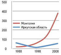 Рис. 3. Динамика въездного иностранного туризма в Иркутской области в сравнении с Монголией, тыс. чел.
