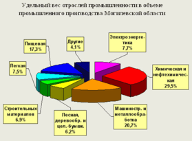 Возможность поставлять продукцию на рынки стран Европейского Союза дает предприятию наличие на выпускаемой продукции знака качества СЕ (маркировка по электробезопасности), подтверждающего соответствие требованиям Директив ЕС. В области в этом направлении работают 5 предприятий, из которых 3 уже получили право на эту маркировку. Могилевская область – главный производитель в Республике Беларусь шин, электродвигателей, центробежных насосов, цемента, шелковых тканей, тюлегардинных изделий, резиновой обуви. Ведущее место занимает химическая и нефтехимическая отрасль. Доля двух крупнейших химических предприятий – ОАО "Могилевхимволокно" и ОАО "Белшина" – составляет более 25% объемов от всей производимой в области продукции. В области создан ряд новых промышленных предприятий, в том числе ПРУП «Белорусский цементный завод» – крупнейший производитель цемента в Беларуси, Быховское ИЗАО «Белатмит», ИООО «ШКЛОВ ФОРЕСТ ЛТД», СЗАО «Стеклозавод «Елизово», ПЧУП «Климовичское предприятие шпалопродукции и стройматериалов», которые успешно наращивают объемы производства промышленной продукции. Ведутся работы по созданию в Шклове фабрики по производству газетной бумаги. Крупнейшими промышленными центрами области являются города: Могилев, Бобруйск, Кричев, Осиповичи.