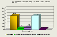 Структура посевных площадей сельскохозяйственного производства- зерновые (44,4%) и кормовые (43,9%) культуры. Посевные площади области составляют 839,3 тыс. га, на зерновые и зернобобовые культуры приходится 372,8 тыс. га, технические – 30,7 в т.ч. лен-долгунец – 10,2, рапс – 15,6 тыс. га. Среди зерновых культур наибольшие площади заняты ячменем, рожью, овсом, пшеницей, среди технических культур – рапсом, льном-долгунцом и сахарной свеклой.