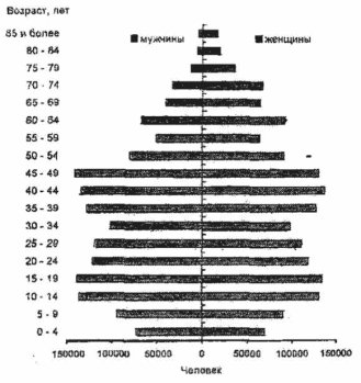 В половой структуре населения ситуация кризисная. До 80-х годов деформация половой структуры была из-за влияния ВОВ, сейчас - из-за социальных проблем. В районе на 1000 мужчин приходится 1087 женщин. По Поволжью женщин на 84 000 больше. Это обусловлено различием средней продолжительности жизни. Средняя продолжительность жизни для всех групп населения - 63,9 лет. Для мужчин - 57 (в России средняя продолжительность жизни - 62 года), женщин - 70 лет. До 40-летнего возраста в населении численно преобладают мужчины, особенно в детских контингентах. Это обусловлено тем, что на 100 девочек рождается 105-107 мальчиков. В силу более высокой смертности мужчин соотношение полов примерно к 40-ка годам выравнивается, а в более старших возрастах количественно преобладают женщины, особенно в возрастных контингентах старше55 лет. В группе преклонных возрастов на 1000 бабушек приходится 345 дедушек (рис.2) 5.