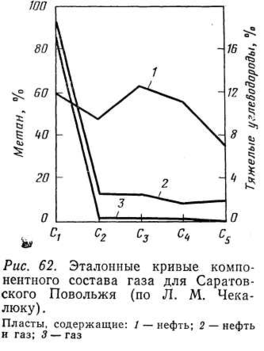 Для определения продуктивных пластов на этапе предварительной интерпретации выделяют аномалии на диаграммах суммарного газосодержания и приведенного газосодержания, которые приближенно вычисляют с помощью станции путем введения поправки за значения коэффициентов разбавления и дегазации, но без учета фонового газосодержания в буровом растворе, закачиваемом в скважину. Для каждого аномалийного интервала строят кривые компонентного состава газа и сравнивают их с эталонными кривыми компонентного состава для типовых залежей данного района (рис. 2). Если фактическая и одна из эталонных, кривых близки, то делают предварительный вывод о соответствующем насыщении пласта (водоносный нефтеносный и т. п.).