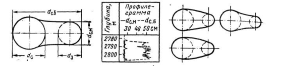 Конфигурацию сечения скважины по профилеграмме определяют графически (рис. 3). Такое построение дает лишь приближенное представление о конфигурации сечения скважины. Легко заметить, что наиболее узкая часть желоба не всегда контролируется диаметром замкового сечения. В зависимости от положения центра прибора в скважине (возможность смещения которого заложена в его конструкции) форма сечения может существенно меняться при одинаковых значениях dc. б и dc. м (рис. 4)
