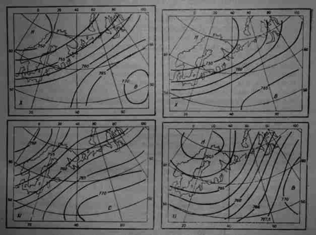 При наличии западного переноса воздушных масс в октябре - ноябре процессы ледообразования произойдут в сроки, близкие к норме. Кроме шаблонов средних изобар, можно аналогичным путем составлять шаблоны пути циклонов и антициклонов, шаблоны так называемых "сборных барических карт". Ценность этого метода заключается в том, что он позволяет связать колебания прогнозируемого элемента с колебаниями общей циркуляции атмосферы.