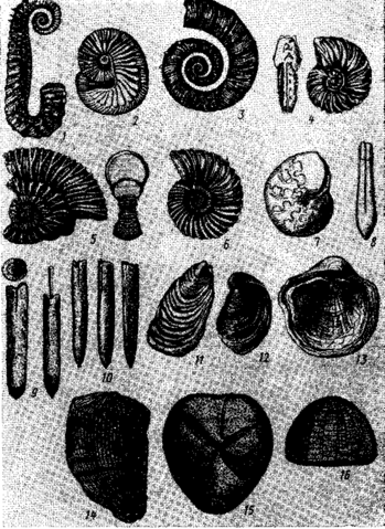 Кораллы претерпели заметные изменения. Появились новые семейства, рифообразующие формы. Ostreidae, Fungidae, Turbi Аммоноидеи: / - Ancyloceras (Ki); 2 - Scaphites (К2); 3 - Crioceras (Ki>; 4 - Schloenbachia (Кг); 5 - Simbirskites (Ki); 6 - Hoplites (Ki); 7 - Tissotia (K2). Белемниты: 8 - Duvalia (Ki); 9 - Actinocamax (Кг); W - Belemnitella (Кг) - Двустворчатые моллюски: 11 - Inoceramus retrorsus; 12 - Buchia (Au-cella); 13 - Gryphaea; 14 - Hippurites. Морские ежи: 15 - Micraster; 16 -