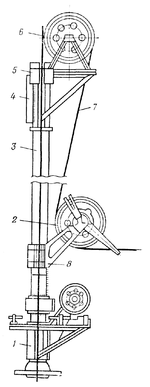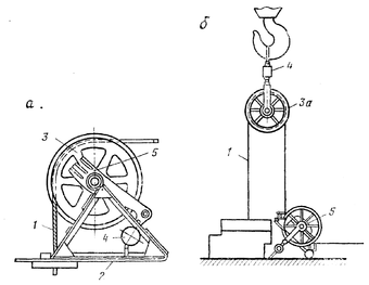 Блок-баланс с роликом служит для направления кабеля в скважину и может быть установлен на стволе ротора — рамочный блок-баланс (рис. 6, а); он может быть также подвешен над устьем скважины на крюке буровой лебедки — подвесной блок-баланс (рис. 6,б).