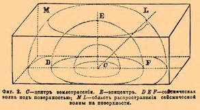 Рис. 2 − С – центр землетрясения, Е – эпицентр, D, E, F – сейсмическая волна под поверхностью, М, L – область распространения сейсмической волны на поверхности.
