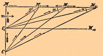 Рис. 1 − Различные углы выхода ударов землетрясения. М, М1, М2, М3 – поверхность земли. С, С1, m – исходные пункты подземных ударов.