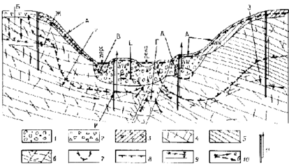 Рис. 1. Подземные воды зоны многолетней мерзлоты (по Н.Н. Романовскому):А - надмерзлотные воды сезонно-талого слоя (СТС); Б - воды сквозного дождевально-радиационного талика; В - надмерзлотные воды подозерного несквозного талика; Г- воды сквозного подруслового талика; Д- внутримерзлотные воды; Е - межмерзлотные воды; Ж - подмерзлотные воды, неконтактирующие, безнапорные; З- подмерзлотные воды, неконтактирующие, напорные; И - подмерзлотные воды, контактирующие, напорные; 1- песчано-галечные отложения, 2- щебень и дресва, 3- щебень и дресва с супесчаным заполнителем,4- трещиноватые сланцы; 5- нетрещиноватые сланцы; 6- зона разлома, 7- граница ММП, 8- граница СТС, 9- уровень подземных вод, 10- направление движения подземных вод, 11- буровые скважины