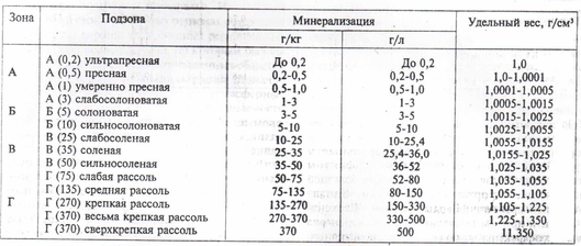 Впервые выделил гидрохимическую зональность по степени минерализации подземных вод В.И Вернадский. Схема гидрохимической зональности по степени минерализации подземных вод И.К. Зайцева и Н.И. Толстихина (1912) оказалась достаточно совершенной. Исходя из этого, на территории РК выделяются следующие гидрохимические зоны: пресных и слабосолоноватых вод с минерализацией до 3 г/л; умеренно и сильносолоноватых вод с минерализацией 3-10 г/л; соленых вод с минерализацией 10-50 г/л; рассолов с минерализацией более 50 г/л. Основные принципы определения гидрохимической зональности по химическому составу разработаны Ж.С. Сыдыковым.