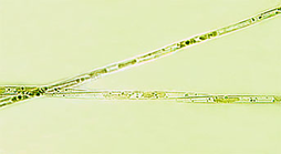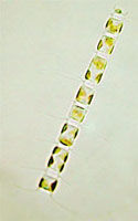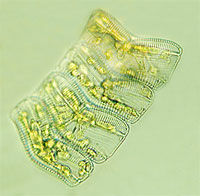 Диатомовые водоросли, Диатомеи, класс Bacillariophyceae - у этих водорослей есть тяжелый кремниевый панцирь из двух половинок (диатома, по-гречески - состоящая из двух частей). Одна половинка - коробочка, в которой лежит клетка, другая половинка - крышечка. Когда диатомеи делятся, две половинки скелета разделяются между дочёрними клетками. Вот сфотографированная сбоку колония цепочка диатомеи ахнантеса, это крупные клетки, и можно разглядеть, где у них коробки, а где - крышки. Между прочим, ахнантес - вид, живущий на дне или на поверхности крупных водорослей. Но течения и волны нередко выносят его в толщу воды - в планктонное сообщество.