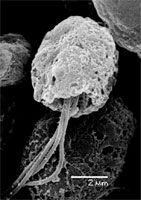 У некоторых даже образовалось нечто вроде рта и выворачивающейся наружу глотки. Этот протоперединиум Protoperidinium granii садится своими ножками на жертву, между ножек выскакивает глотка - и захватывает, затягивает более мелкую клетку, внутрь своей. Настоящий хищник.
