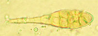 Еще одна водоросль - окрашена в буро-зелёный цвет, у нее явно нет твердого панциря, она многоклеточная. Это проросток бурой макроводоросли - из тех, что мохнатыми кустами растут на подводных камнях, возможно - это начало полутораметрового "дерева" бородатой цистозиры Cystoseira barbata - главной макроводоросли черноморского прибрежья... Пока же в ней - не более десятка клеток, она живет в планктоне, ее влекут течения и может выбросить на берег - тогда она погибнет; она может осесть на песчаное дно, не сможет закрепиться на нем, и ее съедят донные раки... Из тысяч таких проростков выживает и вырастает во взрослое растение - один.