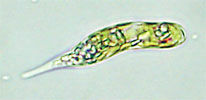 Эвгленовые водоросли Euglenophyceae, родственные зеленым - они не имеют никакого панциря, никакой твердой защиты, только слизевую оболочку - появляются иногда в прибрежных водах, когда создаются благоприятные для них условия - опреснение, избыток питательных веществ - размножаются во множестве, и быстро исчезают - их съедают. Но выжившие - покрываются твердой оболочкой и ложатся на дно, выжидая, когда наступит подходящее время для размножения. У эвглен есть светочувствительный глазок. Вот эта крохотная зеленая колбаска, длиной до 15 микрон, часто появляющаяся у наших берегов, называется эутрепция Eutreptia lanowii.