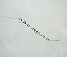 Самые обычные диатомеи в море - хетоцеросы - род Chaetoceros, что, по-гречески, значит - щетинистые. Их можно найти в любой части Мирового океана и почти в любое время года. Это цепочки-колонии клеток, от каждого из углов которых отходит длинная и острая щетинка-хета. Хетоцерос изогнутый Chaetoceros curvisetus - самый обычный в Черном море вид этого рода, да и не только здесь - это успешный космополит.