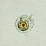 Класс Диктиоховые Dictyochophyсeae (раньше их называли Кремнежгутиковые водоросли, или Силикофлагелляты Silicoflagellata) Обычно, в составе планктона, кремнежгутиковых гораздо меньше, чем диатомей или динофлагеллят. Но иногда, во время весеннего цветения прибрежных вод, в море появляется множество красивых мелких клеток, чей ажурный скелет с длинными шипами-спикулами, как будто выкован ювелиром - это диктиоха Dictyocha sp., одноклеточная водоросль с кремниевым скелетом. Только, в отличие от диатомей, скелет диктиохи не составлен из двух кремниевых половинок, и ещё - силикофлагелляты подвижны, у них есть жгутики. Вот еще одна кремнежгутиковая водоросль - мерингия Meringia sp.