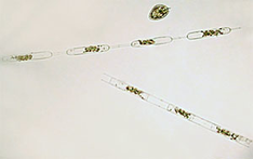 | Хетоцерос сжатый Chaetoceros compressus | Chaetoceros laciniosus - его отличают изогнутые, как длинные щипцы, конечные пары хет колонии | Хетоцерос изогнутый Chaetoceros curvisetus |