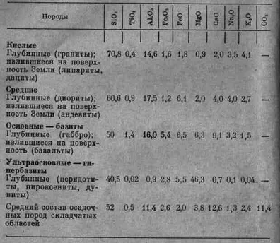 Магматические породы земной коры различаются по химизму и структуре. В зависимости от химического состава магматические породы разделяются на четыре группы (табл. 1.).