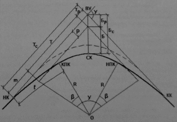 Элементы круговой и переходной кривой рассчитывают по формулам: