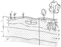 | Схема залегания вод зоны аэрации и грунтовых вод: 1 - зона аэрации, зона насыщения, 3 - капиллярные воды, 4 - почвенные подвешенные воды, 5 - нфильтрующиеся воды зоны аэрации, 6 - верховодка, 7 - грунтовые воды. 8 - поверхность (зеркало) грунтовых вод, 9 - поверхность капиллярной зоны, 10 - водоупорный пласт, 11 - направление потока грунтовых вод. |