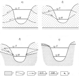 | Схема взаимодействия речных и грунтовых вод: а - постоянная односторонняя гидравлическая связь, б - постоянная двусторонняя гидравлическая связь, в - временная гидравлическая связь, г - отсутствие гидравлической связи. 1 - водоупорный пласт, 2 - уровень грунтовых вод, 3 - направление движения грунтовых вод, 4 - уровень воды в реке в половодье, 5 - уровень воды в реке в межень, 6 - источники (родники). |