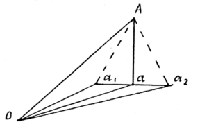 При выполнении этого условия при отвесном положении вертикальной оси теодолита, установленном по уровню при алидаде горизонтального круга, визирная ось трубы при вращении образует отвесное положение коллимационной плоскости (на рис. 3. плоскость 0Аа). Если условие не выполняется, то при вращении трубы визирная ось образует наклонную плоскость 0Аα1 при одном положении вертикального круга и 0Аα2 - при другом. Для выполнения поверки теодолит устанавливают в 10-20 м от стены, перекрестие сетки нитей при круге право наводят на высоко расположенную точку А, закрепляют алидаду, опускают зрительную трубу примерно до горизонтального положения и отмечают на стене точку α1 , на которую проектируется перекрестие нитей сетки. Затем трубу переводят через зенит и при круге лево наводят на точку А, опустив трубу, получают ее проекцию α2. Если точки α1 и α2 совпадут или отрезок α1α2 не превышает ширину биссектора сетки (15-20»), то условие выполнено. При невыполнении условия юстировку выполняют в специальных мастерских.