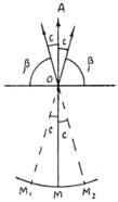 При взаимно-перпендикулярном положении осей при трубы ось образует плоскость, которую называют коллимационной. Если угол β между этими осями отличается от 90° на угол с, называемый коллимационной ошибкой, то при вращении трубы ось zz образует две конические поверхности, и при наведении на точку А вместо отсчета М (рис. 2) получим отсчет