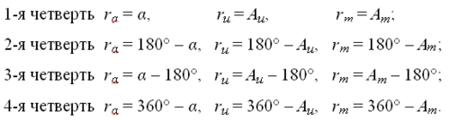 Номер четверти определяется по значению азимута: в 1-й четверти азимут изменяется от 0° до 90°, во 2-й четверти от 90° до 180°, в 3-й четверти – от 180° до 270°, в 4-й четверти – от 270° до 360°. Полное написание румба включает его числовое значение и название четверти (1-я – СВ, 2-я – ЮВ, 3-я – ЮЗ, 4-я – СЗ), например rт = ЮВ: 45°10'. В нашем случае А1-2 = 168°27`.