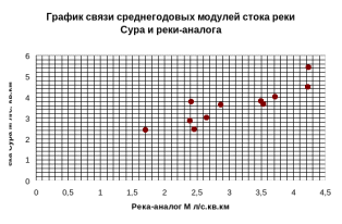 Река-аналог должна иметь многолетний период гидрометрических наблюдений для точного определения нормы стока и не менее 6 лет параллельных наблюдений с изучаемой рекой.