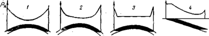 Закономерности изменения свойств нефти и газа по объему залежи. Полное единообразие свойств нефти и растворенного в ней газа в пределах одной залежи — довольно редкое явление. Для нефтяных залежей обычно изменения свойств достаточно закономерны и проявляются прежде всего в увеличении плотности, в том числе оптической плотности, вязкости, содержания асфальто-смолистых веществ, парафина и серы по мере возрастания глубины залегания пласта, т. е. от свода к крыльям и от кровли к подошве в мощных пластах. Фактическое изменение плотности в пределах большинства залежей обычно не превышает 0,05-0,07 г/см3. Однако очень часто градиент нарастания плотности и ее абсолютные значения резко возрастают в непосредственной близости к водонефтяному контакту (ВНК, рис. 1,1, 2), где могут встречаться полутвердые асфальты и твердые битумы. Иногда эти малоподвижные нефтяные вещества образуют монолитный слой в подошве залежи, который полностью или частично запечатывает залежь, изолируя ее от законтурной водоносной зоны. Нередко плотность нефти выше изолирующего слоя практически постоянна (рис. 1,3). В залежах «открытого» типа, приуроченных к пластам, выходящим на дневную поверхность, и запечатанных с головы асфальто-кировыми породами, плотность нефти с увеличением глубины уменьшается, достигает минимума, а затем увеличивается по мере приближения к ВНК (рис. 1,4).