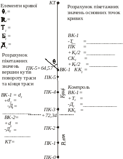 Одночасно з веденням пікетажного журналу, виконують розрахунок пікетажних значень основних точок кривих та пікетажних значень вершин кутів повороту траси і кінця траси.