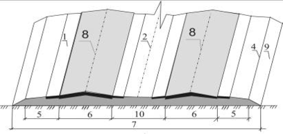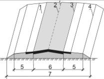 частини, 4 – бровка земляного полотна, 5 –обочина, 6 – проїжджа частина, 7 – земляне полотно, 8 – вісь проїжджої частини, 9 – укіс насипу,10 – смуга поділу.