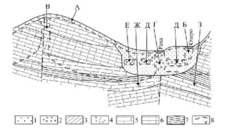 Распределение подземных вод в многолетнемерзлых породах: А – надмерзлотные воды, Б – воды несквозного подозерного талика, В – воды сквозного питающего талика, Г – воды сквозного подруслового талика, Д – межмерзлотные воды, Е – внутримерзлотные воды, Ж – подмерзлотные воды контактирующие, З – подмерзлотные воды неконтактирующие; 1 – пески; 2 – гравийно-галечные отложения; 3 – суглинки; 4 – щебень и дресва; 5 – известняки; 6 – песчаники; 7 – сланцы; 8 – граница многолнтнемерзлых пород