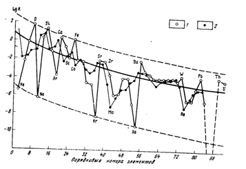 Распространенность хим. элементов связана с их положением в периодической системе. Как отмечал еще Д.И. Менделеев, наиболее распространенные элементы земной коры располагаются в начале периодической системы. С увеличением порядкового номера распространённость элементов неравномерно убывает. Таким образом, в земной коре явно преобладают легкие элементы. А.Е. Фермсан для более наглядного изображения особенностей распространения хим. элементов построил полулогарифмический график (рис. 1)