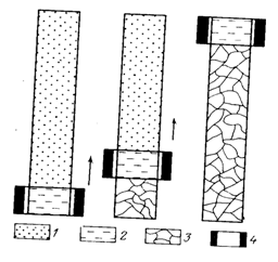 В трубку поместили смесь соединений, обладающих различной температурой плавления. При помощи нагревателя 4 расплавим узкую зону внизу трубки и будем перемещать нагреватель вверх вдоль трубки. По мере движения нагревателя всё вещество трубки пройдет стадии плавления и последующей кристаллизации. Если такую операцию повторить неоднократно, то исходная смесь разделиться: вверху обособятся более легкоплавкие соединения, внизу – более тугоплавкие. Данные механизмы имеют место при образовании земной коры. При достижении массой Земли некоторой критической величины произошло образование ядра. Под влиянием энергии, выделяемой при распаде радиоактивных элементов, а также за счет гравитационного уплотнения, началось разогревание первоначально холодной Земли. Расплавленные массы под влиянием конвекционных токов перемещались в радиальном направлении к поверхности Земли, проплавляя при совем движении вещество мантии. Многократное повторение этого процесса обусловило закономерную дифференциацию вещества, а именно- вынос из мантии относительно легкоплавких соединений (К2О, Na2O, SiO2, Al2O3), накопление их в верхней оболочке Земли, которую мы называем земной корой. Таким образом, по механизму своего образования земная кора есть не что иное, как продукт дифференциации мантии. Одновременно с выплавлением легкоплавких соединений из вещества мантии происходило выделение паров и газов. В результате дегазации мантийного вещества образовалась основная масса газов и воды, имеющихся на Земле. В настоящее время можно считать установленным, что единственным источником паров воды, при конденсации которых могли образоваться огромные массы Мирового океана, было вещество мантии Земли.