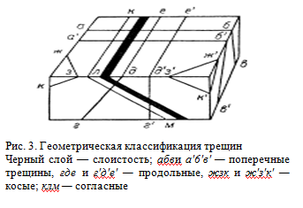 В геометрической классификации трещин в осадочных и метаморфических породах, обладающих ясно выраженной слоистостью или имеющих неясную слоистость, но четкую сланцеватую текстуру, выделяются (рис.3):