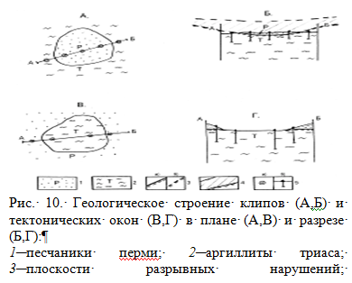 Выходы пород автохтона среди аллохтонных (например, в долине реки, эродирующей тело шарьяжа) называются тектоническими окнами (рис. 10.)