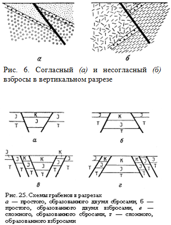 Взбросами называются нарушения, в которых поверхность разрыва наклонена в сторону расположения приподнятых пород.