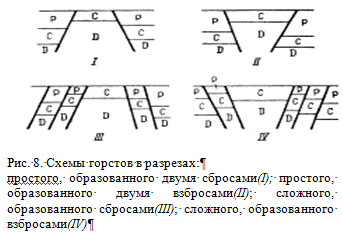 Горстами называются структуры, образованные сбросами или взбросами, центральные части которых приподняты и на поверхности сложены более древними породами, чем породы, обнаженные в их краевых частях (рис. 8).