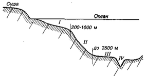 Вся совокупность водных пространств океанов и морей, занимающих 361 млн. км, или 70,8% поверхности Земли, называется Мировым океаном или океаносферой. Мировой океан включает четыре океана: Тихий, Индийский, Атлантический, Северный Ледовитый, все окраинные (Берингово, Охотское, Японское и др.) и внутриконтинентальные моря (Средиземное, Черное, Балтийское и др.). Особенностью океаносферы является единство и взаимосвязь между отдельными частями - океанами и морями. Окраинные моря, будучи отделены от океанов только отдельными островами или подводными возвышенностями, характеризуются относительно свободным водообменом с океанами. Внутриконтинентальные моря, окруженные материковой сушей, имеют связь с океанами через относительно узкие проливы, что вызывает изменения в динамике, составе вод и в других показателях. Море – это одна из главных геологических сил, преобразующих облик Земли. В морских бассейнах, как обычно именуют, моря и океаны, протекают сложные процессы энергичного разрушения, перемещения продуктов разрушения, отложения осадков и формирования из них различных осадочных горных пород. Эти процессы наиболее интенсивно проявляются в прибрежной мелководной зоне (0-200м) - зоне шельфа, которая окаймляет сушу полосой различной ширины и представляет собой подводное продолжение континентов (рис. 11). Площадь шельфа составляет 7,6% площади морей и океанов.