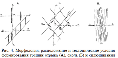 Обычно одновременно формируются не менее 2 систем так называемых сопряженных во времени и пространстве (синхронных) трещин скола. В кинематическом отношении эти трещины относятся к категории взбросов (взбросо-сдвигов, сдвигов и др.).(рис.4.).